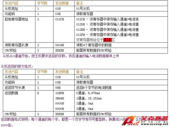 例如:485總線上掛接了一個型號為420MA-IN4型的從機(jī),ID為01H,共4個電流輸入通道,讀取所有4個通道電流數(shù)據(jù)。