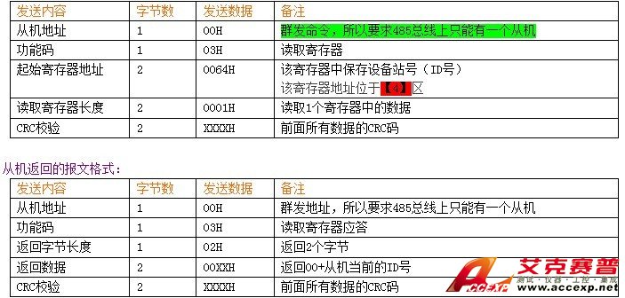 例如:485總線上只掛接了一個型號為420MA-IN4型的從機(jī),該情況下可以對其下發(fā)讀取ID命令。