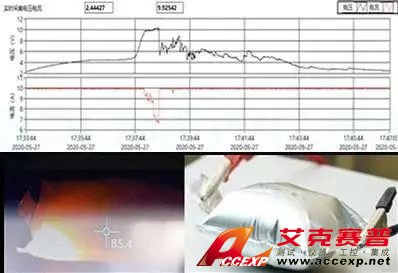 以過充電為例,針對過充電對電池單體進(jìn)行測試,電池電壓不斷變大,溫度不斷升高,電池內(nèi)部高電壓造成電解液分解,電池內(nèi)部產(chǎn)生大量氣體,電池鼓脹,繼續(xù)充電,在高溫高壓下大量氣體從內(nèi)部噴出,形成煙霧,隨后被擊穿導(dǎo)通。