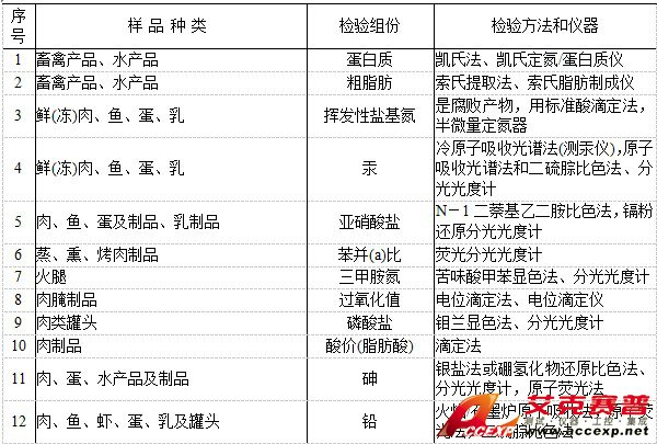 畜禽產品和水產品種類多、制成品更多,消費量也越來越大,所以對其營養價值、動物疫病、微生物、農藥和獸藥的殘留、環境污染等為當今世人十分關注, 除了仍重視感官指標的檢驗之外,將更多地依賴于用科學儀器檢驗,且其指標、方法不斷地修訂增補,所以檢驗中所運用的分析方法與儀器實難用有限篇幅說清,現僅選一些已廣為重視的理化指標的檢驗例子,予以簡釋,如表9所示。