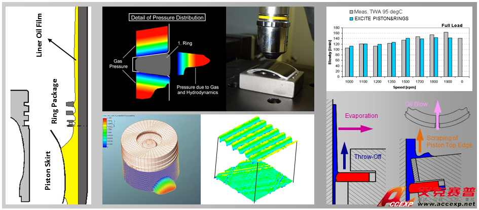 Accexp解決方案EXCITE PISTON&RINGS考慮潤滑、燃氣以及彈性體間的相互關系,分析評估活塞二階運動及活塞拍擊噪聲,同時也可對活塞型線、活塞銷偏置等進行參數敏感性分析。在此基礎上,評估活塞環運動、環后壓力以及引起竄氣與機油消耗的預測,也可對環組運動表面進行分析,如液動摩擦損失、缸套與活塞環磨損等。