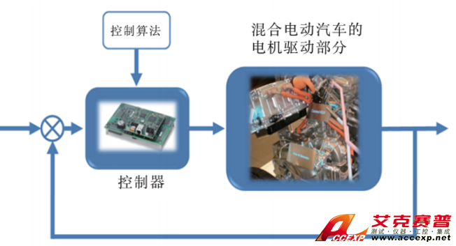 電力系統實時仿真是隨著硬件技術、實時操作系統、電力系統建模等新技術發展起來的實驗和研究方式,實時仿真裝置的基本原理是用運行著數學模型的實時計算機系統來模擬實際系統的行為,這樣科研人員就可以通過實時仿真器來測試控制器,對控制設備進行非常接近真實情況的測試與驗證。這樣通過實時仿真器進行測試與驗證的方式也常被稱為硬件在環仿真測試 (Hardware-in-the-loop Testing),或者半實物仿真測試等。下面 2 張圖展示的是兩種不同的研究和測試混合動力汽車里的電機驅動部分的控制器的方式,分別是同實際的物理設備構成閉環,以及同實時仿真器構成閉環。這兩幅圖既展示了實時仿真的概念,也可以看到實時仿真的一個特點是控制器同實時仿真設備的接口和控制器與真實設備的接口是完全一致的,這樣可以方便的讓科研人員和學生從實時仿真實驗過渡到實際設備的控制上。