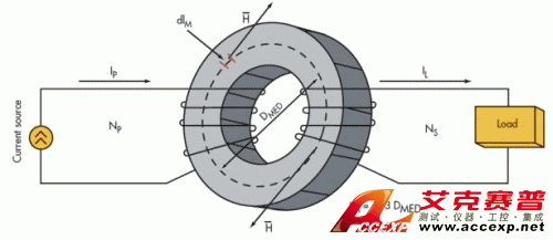 根據安培定律,電流IP流過匝數為NP的繞組(圖2)時,根據磁力線長度IM將產生磁場,可由微分方程表示: