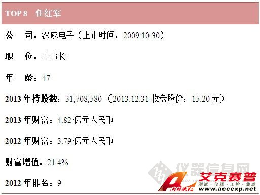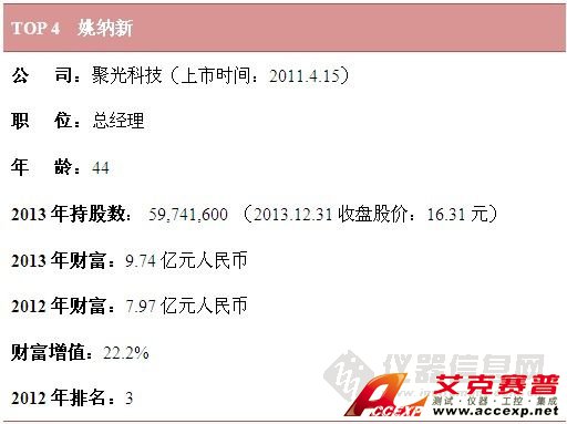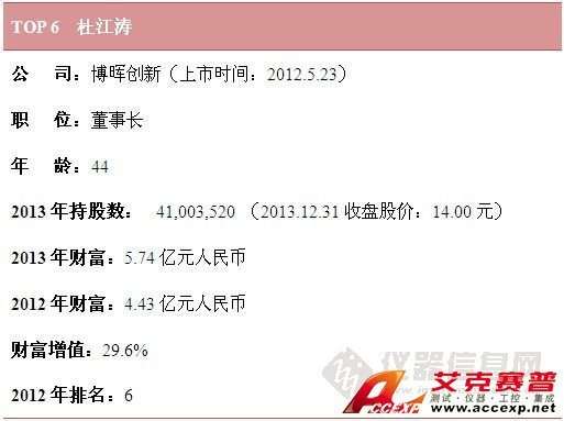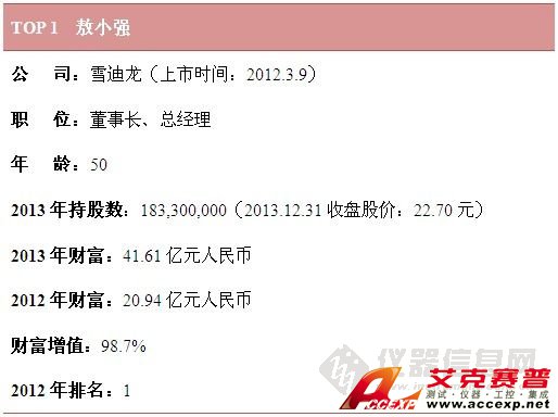 就財(cái)富值而言,雪迪龍敖小強(qiáng)憑借100%的增幅穩(wěn)居財(cái)富榜榜首,位居第2位的是聚光科技董事長(zhǎng)王健,其2013年財(cái)富為18.52億元人民幣,排名第3的是天瑞儀器董事長(zhǎng)劉召貴。