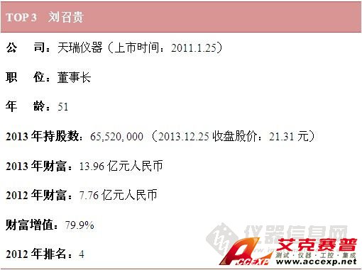增幅排名第2的是天瑞儀器董事長(zhǎng)劉召貴,其財(cái)富增長(zhǎng)了約80%,2013年個(gè)人財(cái)富約14億元人民幣。2013年,天瑞儀器收購(gòu)了環(huán)境監(jiān)測(cè)儀器企業(yè)宇星科技,之后股價(jià)呈現(xiàn)一路漲勢(shì),借此劉召貴的財(cái)富實(shí)現(xiàn)大幅增長(zhǎng)。
