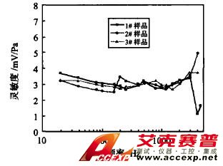 實驗樣品采用北京信息工程學(xué)院研制的YLC-A型壓電式微壓傳感器,樣品數(shù)為3只。將傳感器安裝在測試腔蓋樣品架上,輸出端與腔蓋上的樣品輸出引線連接,扣緊腔蓋,按圖1所示連接系統(tǒng)。由于傳感器內(nèi)裝前置放大器,需提供直流電源工作,電源加在腔蓋上被測傳感器輸出端。調(diào)節(jié)信號發(fā)生器產(chǎn)生正弦信號,信號幅度不宜過大,以避免傳感器輸出失真。選取多個信號頻率,分別測量每個頻率點兩傳感器的輸出電壓,在1kHz處示波器上的標(biāo)準(zhǔn)傳感器波形(1)的峰-峰值電壓為145.5mV;被測傳感器波形(2)的峰峰值電壓為5.85V。將V標(biāo)和V測代入式(1)算出被測傳感器的靈敏度。根據(jù)計算結(jié)果繪制傳感器的靈敏度隨頻率變化曲線,如圖2所示,從而得到傳感器的頻率響應(yīng)范圍。