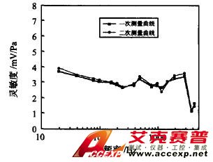 為檢測測量系統(tǒng)的重復(fù)性,實驗對1#傳感器進行了重復(fù)測量,圖3示出2次測量的靈敏度變化曲線。