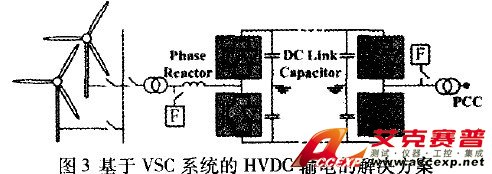 基于電壓源變流器(VSC)的HVAC輸電系統(tǒng)越來越受到廣泛的關(guān)注,不僅僅足跟電網(wǎng)相連的大型離岸風(fēng)電場的關(guān)系。現(xiàn)在基于VSC的解決方案已經(jīng)被ABB公司推向市場,并且命為“HVAC light”,Simens公司命名為“HVAC Plus”。圖3給出了基VSC的HVD輸電系統(tǒng)的原理圖。這種相對較新的技術(shù)(在1999年被商業(yè)化安裝運(yùn)行)只有在能自關(guān)斷電流的IGBT器件發(fā)展下才可能實(shí)現(xiàn)。這意味著已不需要一個有源換流電壓了。因此,基于VSC的HVDC輸電系統(tǒng)就不再需要很強(qiáng)的離岸和岸上的交流電網(wǎng),甚至能在完全癱瘓的電網(wǎng)中啟動(黑暗啟動能力)。但是,這種系統(tǒng)還有其他一些優(yōu)點(diǎn):無功和有功可以分別獨(dú)立控制,這樣就可以減少對無功功率補(bǔ)償?shù)男枰⑶夷芴岣呓涣麟娋W(wǎng)在它們連接點(diǎn)的穩(wěn)定性。