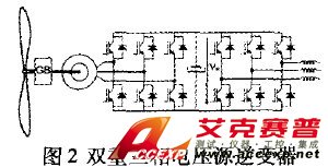 1)利用雙反饋感應(yīng)發(fā)電機(jī)(DFIG)的變速技術(shù):這種強(qiáng)迫開關(guān)的功率變流器的原理圖如圖1所示。變流器包括兩個三相AC—DC功率變流器,兩者由一個直流電容器電池鏈接。這種結(jié)構(gòu)一方面保證對機(jī)器的有功功率和無功功率進(jìn)行矢量控制,另一方面還能減少功率變流器注入電網(wǎng)的諧波大小。