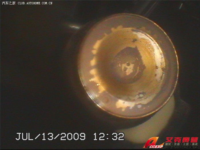 1#缸噴油嘴:可以清晰地看見中心的小孔,而且邊界清晰——干凈。邊緣的印漬的是汽油揮發后留下,不是積炭和積膠