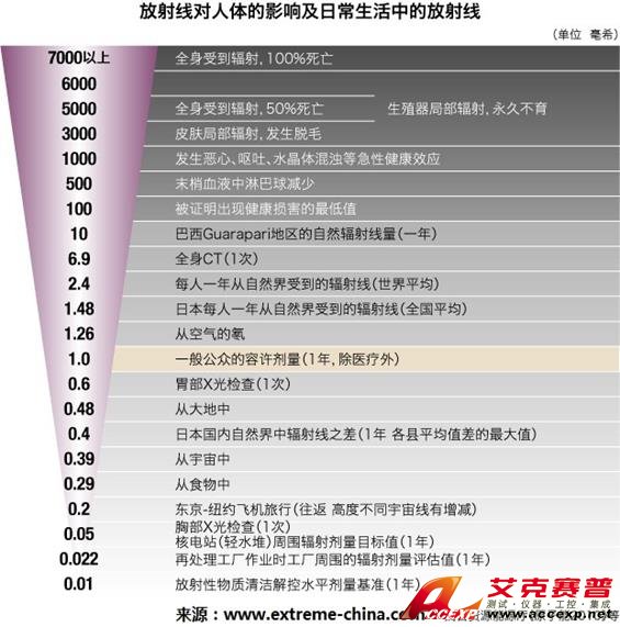 環境中本身存在的各種放射線輻射對人體是無害的,取決于包括大氣情況和地理位置各種各樣的因素,全世界核發輻射平均水平在約0.05 μSv/hr - 0.40 μSv/h之間,在中國,這個值是約0.13~ 0.25μSv/h左右。但是, 真正需要關注的問題不僅包括環境本底以外的輻射的強度 ,更值得注意的是輻射的累積效用。