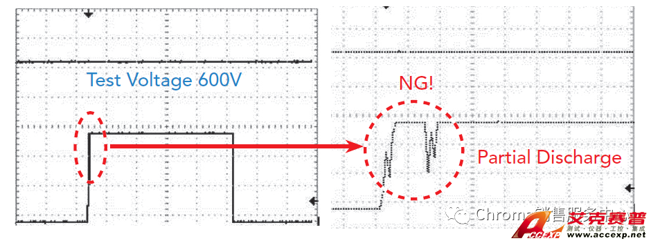 圖6 如果沒有監(jiān)控波形,有任何PD或flashover發(fā)生使波形發(fā)生異常變化,都無法偵測到,Chroma 11210可監(jiān)控電壓電流波形,在右圖可以觀察到有兩次PD現(xiàn)象發(fā)生,一次在CV模式、另一次在CC模式