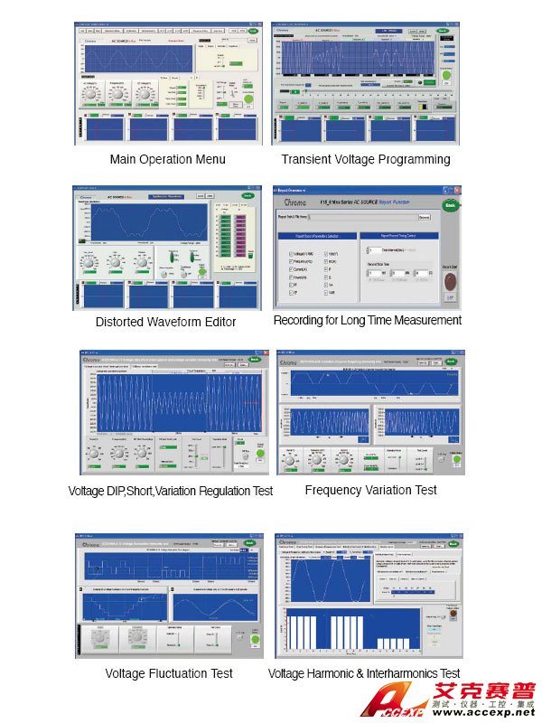 中茂 Chroma 61500 可編程交流電源提供圖形化接口的控制軟件, 提供簡易設定及操作, 可執(zhí)行所有的功能. 并內(nèi)建測試法規(guī). 并可以長時間記錄量測值, 存成檔案供分析.