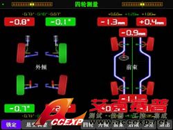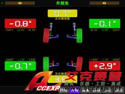 | 單獨的測量系統:(外傾角)功能畫面設計了,以車輪傾斜變化和顏色的區分不復雜,清晰及容易解說 | 方向盤自動計算調整系統 |