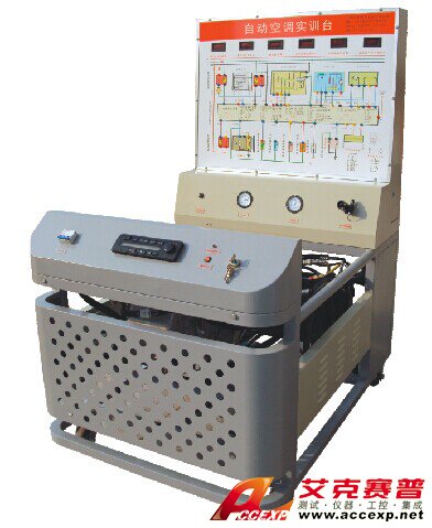三相調速電動機、空調蒸發箱、壓縮泵、空調控制系統電氣元件、壓力表、送風管路、空調散熱器、干燥瓶、空調控制電腦、空調系統各傳感器及執行器、高低壓壓力表、故障設置和排除盒、控制面板、大型彩色噴繪電路原理圖、可移動臺架、電源、OBD診斷座、發動機控制電腦及曲軸傳感器、實訓指導書。