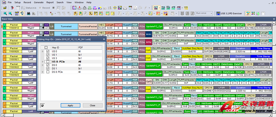 Voyager利用了傳奇的CATC Trace –行業實際的標準顯示,可以在單個視圖中顯示所有帶有標簽和交錯的數據包。邏輯USB4和邊帶通道的流量可以單獨進行跟蹤過濾,搜索或導出。可以擴展和折疊傳輸級別,以顯示包括所有有序集和控制數據包的邏輯層。在排隊時,它將記錄并顯示所有寄存器的讀寫,以提供路由器和路徑配置空間的清晰畫面。HopID窗口允許基于Hopid和協議定義的功能(PDF)精確隱藏流量。隔離特定路徑上的流量可為網絡中的每個PCIe,USB或DP適配器提供完整配置順序的連貫圖。