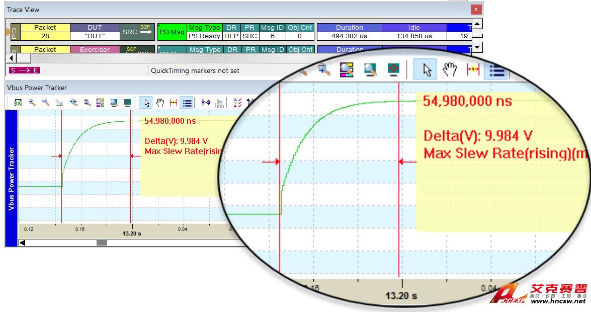 Voyager M4x Power Tracker選項以時間線格式監視并以圖形方式顯示vBus電源和電流。電壓被同步以跟蹤事件,從而允許用戶驗證協議和電氣層的電源狀態轉換。為CC和VCONN提供了獨立的功率圖,從而易于調試邏輯C型狀態轉換。