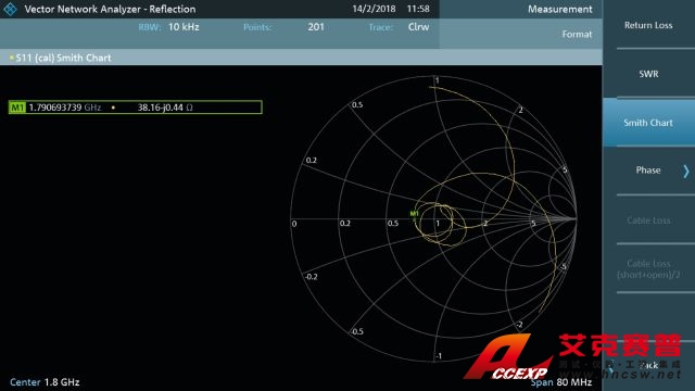 R&S FPC1500 采用獨特的內(nèi)部 VSWR 電橋設(shè)計,可以執(zhí)行單端口矢量反射測量。此功能可用于射頻天線或射頻電路的阻抗測量,并可顯示史密斯圓圖;或進(jìn)行故障點距離測量以檢測長射頻電纜的故障點。