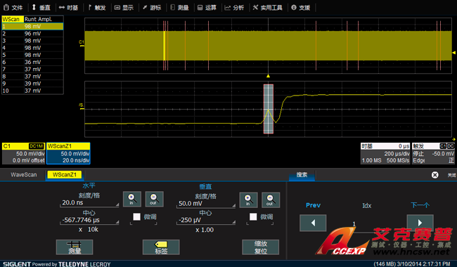 WaveScan被稱為示波器中的Google, 能夠實時地對采集到的波形進行測量分析,搜索出感興趣的信號,可對搜索到的信號進行列表顯示、高亮標識和放大觀察,可以靜態地“查找”,也可以動態地“掃描”。
