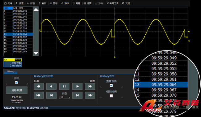 鼎陽SIGLENT SDS3104X智能示波器觸發包括窗口、間隔、漏失、欠幅、斜率、邊沿、脈寬、判定合格、邏輯圖、高清視頻和串行總線觸發(I2C、I2S、SPI、UART/RS232、LIN、CAN、CAN-FD、FlexRay、MIL1553、USB 2.0)。并且還標配了順序和歷史模式。順序模式下,兩幀之間的最小死區時間為1 us, 其等效刷新率可達100萬幀/秒。 配合后臺運行的歷史模式是故障分析的有力工具。
