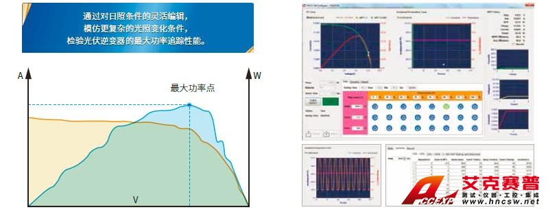 由于太陽能電池利用率不僅與其內部特性有關,還受到天氣、季節、溫度、照度、云遮、下雨和下雪等因素的影響,在不同的時段會具有不同的I-V特性。因此光伏逆變器必須具備應對策略,實時調整太陽能電池的工作點,使之始終工作在最大功率點附近,這一過程就稱之為最大功率點跟蹤MPPT。IT6000PV系列標配的太陽能電池矩陣仿真軟件可以在實驗室的測試環境下,去直接模擬各種真實條件下的太陽能電池陣列,從而測試光伏逆變器的靜態 & 動態最大功率點追蹤效能。