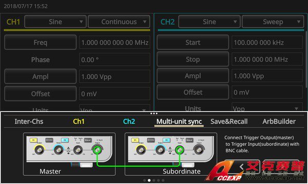 AFG31000 簡化了這個(gè)過程,它在屏幕上有一個(gè)向?qū)Чぞ撸梢砸龑?dǎo)用戶完成電纜連接和設(shè)置配置,實(shí)現(xiàn)多臺發(fā)生器同步。