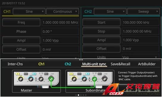 AFG31000 簡化了這個過程,它在屏幕上有一個向導工具,可以引導用戶完成電纜連接和設置配置,實現多臺發生器同步。