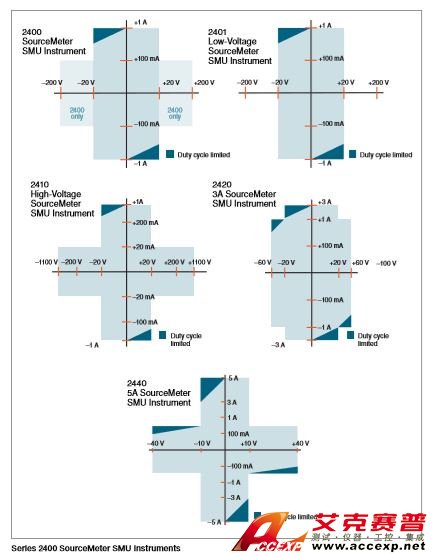 所有數字源表均提供4象限工作。工作在第1和第3象限時,作為電源向負載輸出 功率。工作在第2和第4象限時,作為阱(負載)吸收能量。在源或阱工作期間都能測 量電壓、電流和電阻。